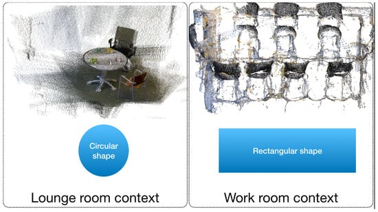 Let us take as an example two different geometries of tables. The first geometry of a table defined as a working table is associated with a scene context of working rooms. It corresponds to the context shows in Figure 6. The working table is described as a table composed of a specific tray that has a rectangular shape. The second geometry of a table defined as round table is associated with a context of lounge rooms. The round table is described as a table composed of a specific tray that has a circular shape. Both these specific descriptions of table respect the general semantic description of a table presented in Section 2.2.2. Figure 7 illustrates this difference of geometry linked to a specific context.
