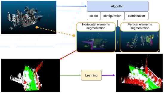 The results provided by each executed algorithm are analyzed and correlated with each other (shown by orange frames in Figure 9) to identify objects and geometries in the data (shown by the red arrow in Figure 9). In this case, the analysis and correlation of algorithm results allow identifying ground (in green) and some facades (in red). The management of algorithms and the interpretation of results are entirely driven by reasoning. This reasoning is based on the knowledge presented in Section 2.2.