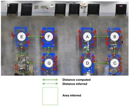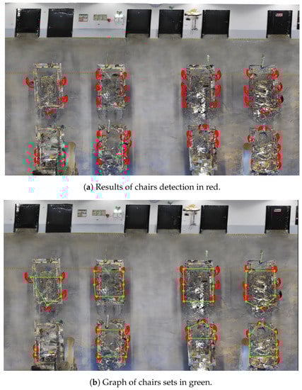 Topological links facilitate the object detection by providing further information to classify it or by deducing the position of an object through the detection of another. Let us take as an example the topological relationship between a table and chairs in the use case presented in Figure 6. A table is described as surrounded by chairs. The property surround of an object by a set of objects is further defined through a relationship between their shapes. As shown in Equation (2), the definition of the surround property applied to this case of tables say that “a table () is surrounded by a set of chairs ()” is equivalent to says that “the shape () of the table () overlaps the shape () built from the set of chairs ()”.