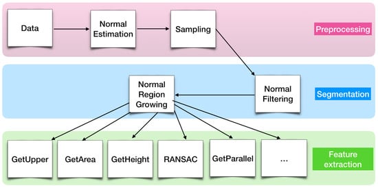 Let us take the example of a facade defined as a planar surface perpendicular to the ground with a height of at least 12 m. The detection of this facade requires algorithms for plane detection, size estimation and topological link assessment (e.g., parallel, perpendicular). These algorithms may have prerequisites such as normal estimation or whether the data is small in size or not noisy. Thus other algorithms such as normal estimation, denoising and, sampling algorithms must be combined in a sequence to satisfy the needs of some selected algorithms in some cases.