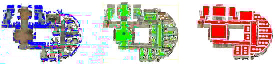 This paper introduces an approach that addresses this issue through a dynamic and smart adaptation of the detection process. This adaptation takes into account the data variation and object representation variation. This approach first detects and classifies walls, ceilings and floors, as shown in Figure 19. Secondly, the reasoning and iterative classification process build rooms according to the links between walls, ceilings and floors. The comparison of this approach with References [,] approaches on the same data allow the illustration of its benefits. Reference [] provides the data used for the comparison. This data is the third area corresponding to a point cloud composed of more than 22 million points. These approaches ([,]) fail to detect the overall rooms as shown in Figure 23.