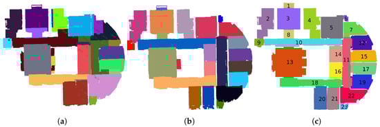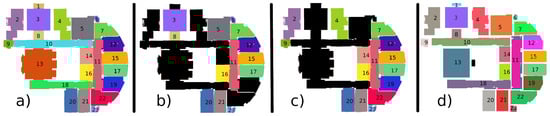 The approach of Reference [] proposes computing the internal free space by segmenting the point cloud into voxel and labelling them as “free” or “busy.” From this voxel labelling, the approach computes the maximum detection in the potential field values. Then, the approach projects the potential field values computed in 3D in 2D space in the positive z-direction. Finally, this approach uses the HDB-SCAN approach [] for clustering the point cloud and then labels it. Nevertheless, such an approach has difficulty to segmenting rooms which contain several elements due to the sensitivity of the volumetric signature estimation, which is the case for rooms 5 and 6. Moreover, the irregularities in the potential field map computed lead to miss-segmentation, especially for transitions between long corridor rooms, which is the case for rooms 10 and 18. Therefore such approach detects the six rooms 1, 3, 8, 10, 13 and18 as the same room. Figure 23c shows in black every room not well detected by this approach.