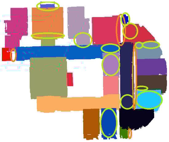 The proposed approach detects the 22 rooms of the use case. However, among the 22 rooms, room 13 in Figure 23d is not fully detected and a sub-part of this room is detected as a room itself (the green part near room 13 in Figure 23d). Some parts of the room (small parts in room 13 in Figure 23d) are not classified due to their characteristics. They correspond to exterior elements of room 13, as illustrated in Figure 24. Thus, room 13 of the presented approach is considered not correctly detected.