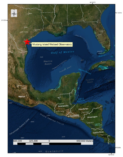 Study area at Mustang Island Wetland Observatory located on Mustang Island along the Texas Gulf Coast, USA. Refer to Figure 2 below for a detailed view of the study site.