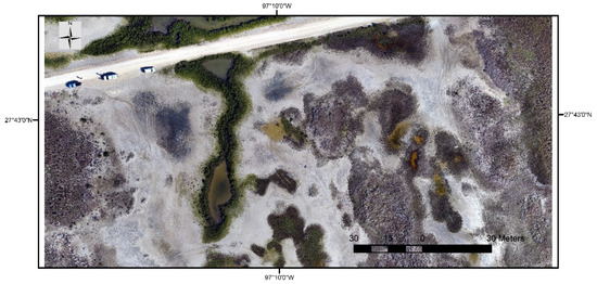 Orthomosaic aerial image of the study area at Mustang Island Wetland Observatory on 20 December 2017. Aerial imagery was acquired from a small-unmanned aircraft system (UAS), DJI Phantom 4 Pro, equipped with a 20 MP RGB camera.