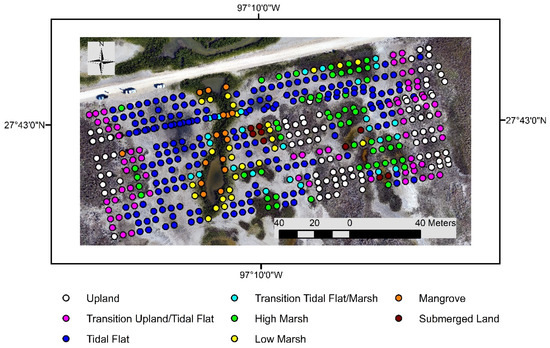 Real-time kinematic (RTK) survey points overlaid on an unmanned aircraft system (UAS) background image showing distribution of RTK points collected for each marsh environment.