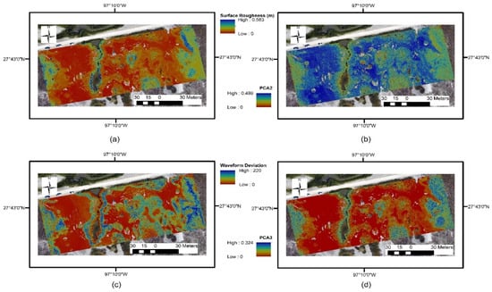 Figure 4. (a) Surface roughness (), (b) principal component analysis (PCA) eigenvalue second dimension (, (c) median of the waveform deviation (, and (d) PCA eigenvalue third dimension are presented as rasters with a resolution of 0.2 m. - Information within the point cloud can be processed to indicate if the local geometry is more like a line (1D) ( ≈ 1 and ≈ 0), a plane surface (2D) (≈ 0), or whether points are distributed within the whole volume around the considered location (3D) (≈ ≈ . Maps of and values are presented in Figure 4. In Figure 4, one can see that the values of the tidal flat areas (in blue) are about 0.5. The same tidal flat areas have values close to zero (red). The values of vegetated areas are close to zero (yellow) while the values are about 0.3 (blue). These values indicate that the geometry of these tidal flat areas is characterized as 2D-like surfaces, while the vegetated areas are characteristic of a 3D-like geometry. Refer to [40] to see how the PCA eigenvalues (, are computed from a set of points within a circular neighborhood.