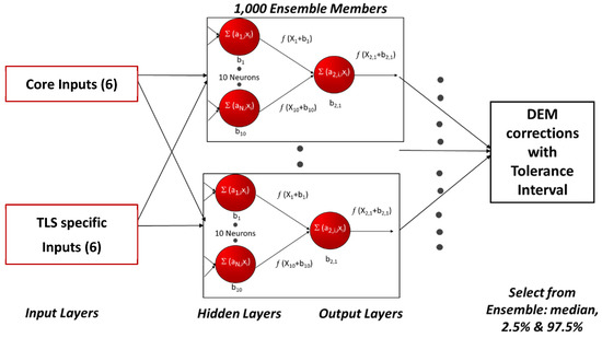 The novelty of the approach presented herein is in the development of an ensemble of ANNs, referred to as an ensemble neural network (ENN), to model the spatial variability in DEM error for cell by cell error corrections while simultaneously estimating the tolerance interval (uncertainty) for every correction. The use of an ensemble approach allows for training individual neural networks over different samples of the scene, hence quantifying its spatial variability. In addition, this method is developed such that it can be generalized to any DEM derived from a 3D point cloud with flexibility in the number and selection of model inputs and type of geodetic measurements, such as RTK-GNSS, ALS, TLS, or UAS-SfM. This method is demonstrated for a 3D point cloud derived from a TLS survey through a five-step process outlined as follows: