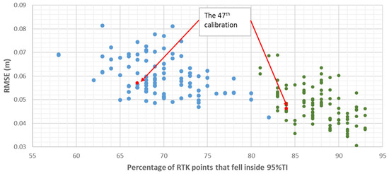 Statistical evaluation of 6 (blue) and 12 (green) input ensemble neural networks (ENNs) based on root mean square error (RMSE) and percentage of RTK points that fell inside the ENN tolerance interval (TI) for 100 independent runs. Calibration case 47th (red) is the most representative when considering both six-input and 12-input ENNs.
