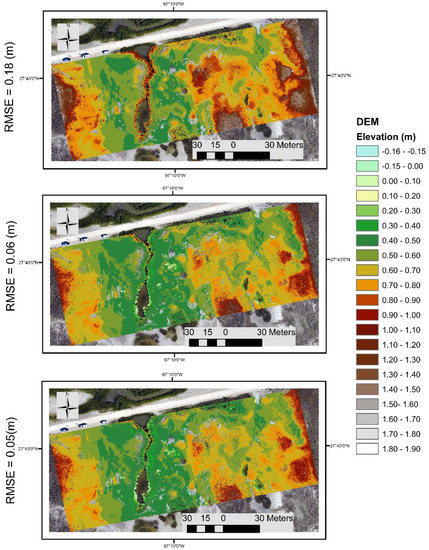 According to Bangen’s research [14], TLS bare earth accuracy on vegetated terrain can be lower than airborne lidar or traditional land surveying methods due to the oblique scanning perspective of TLS being more prone to surface occlusion and elevation bias by the vegetation cover. An accurate and precise DEM derived from TLS data collected from such a complex terrain as a marsh environment remains a challenge. Therefore, this research uses point cloud data collected from a TLS survey at a coastal marsh site to develop, implement, and validate the method. The secondary purpose of this research is to develop a method that can be applied to any 3D point cloud with flexibility in the number and selection of model inputs and type of geomatics measurements, and applicable to any type of terrain environment. Two types of models are calibrated and validated based on two sets of inputs: (1) A core set of generic inputs derivable from any 3D point cloud generated by various geodetic scanning or imaging techniques and (2) additional sensor-specific inputs available from the utilized TLS scanner. A root mean square error (RMSE) and 95% tolerance interval based on an independent validation data set are used throughout the research to analyze and compare the models’ performance. Although the method is evaluated on a DEM derived from TLS point cloud data, it is developed to be generalizable to a DEM derived from any set of 3D elevation points given a sparse set of ground truth measurements.