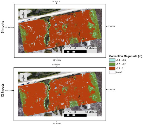 To further investigate the magnitude of the ENN corrections for 6 and 12 inputs, the difference in elevation between the uncorrected DEM and corrected DEM (correction magnitude) for each grid cell based on the 6- and 12-input models are displayed in Figure 8. For both 6- and 12-input models, most of the corrections are negative indicating that the corrected DEM elevations are generally lower than the uncorrected TLS derived DEM. The uncorrected DEM is mostly and significantly overestimating the bare earth surface elevation for the areas with tall and dense vegetation cover. Much smaller corrections were applied to exposed ground, and the areas with low and sparse vegetation, in a range of −0.2–0 m (orange). Most of the largest corrections are in a range of −0.2–1.1 m and occurred for the areas with tall and dense vegetation cover such as uplands and mangroves. These results show that most of the uncorrected DEM errors and uncertainties were associated with the areas with taller and denser vegetation cover as expected.