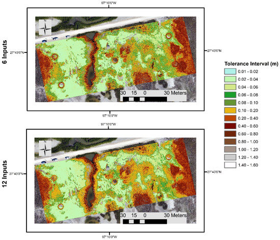 To study the reliability and applicability of the corrections, the uncertainty range (95% tolerance interval) of every correction for every DEM grid cell is mapped in Figure 9. As observed when comparing Figure 8 and Figure 9, the correction and its uncertainty are positively correlated. The bigger the correction, the larger its uncertainty range. The uncertainty range of the areas with upland and mangrove vegetation cover is in a range of 0.2–1.6 m and in a range of 0.02–0.2 m for tidal flat, marsh, and transition areas. The largest difference between the uncertainty ranges of six-input and 12-input models is found for transition and marsh areas. The 12-input model has a larger uncertainty range in this area and is likely the result of the additional TLS specific inputs providing a better characterization of areas with low and sparse vegetation cover to the ENN. Such information is not as valuable for the exposed ground, such as tidal flats, and the tolerance intervals are similar for both 6- and 12-input models for these areas.