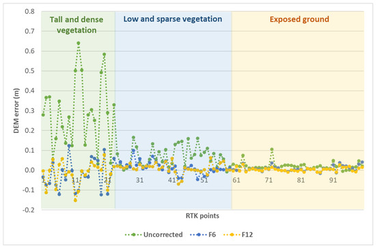 - For the areas with lower and sparse vegetation cover, the uncorrected DEM also overestimated the RTK measurements (Figure 10). The overestimation error is in a smaller range of 0.02–0.16 m and with a median of 0.08 m. Based on the DEM error comparison, ENN performances were similar for six inputs and 12 inputs. Corrected DEM errors for both input sets were in the range of −0.04–0.04 m with a median of 0.004 m. The results show that the ENN method leads to a more accurate DEM even though the corrections are smaller at these areas.