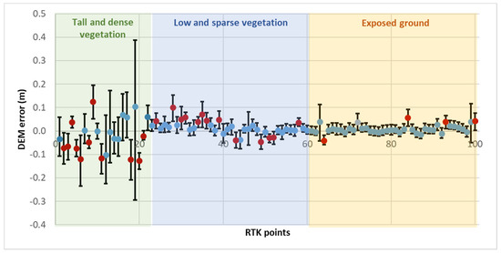 The residual errors of the uncorrected and corrected DEMs compared to the RTK ground truth measurements are calculated as and , respectively, and illustrated in Figure 10. For the corrected DEMs, positive values indicate that the actual corrected elevations are higher than the RTK ground truth elevations (overestimated). Zero values indicate that the corrected elevation values are near equal to the RTK values. Negative values indicate that the corrected elevations are lower than the RTK values (underestimated).