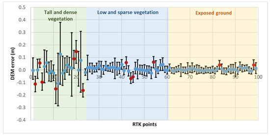 Corrected DEM error and estimated 95% tolerance intervals/uncertainty ranges of the error corrections for the 12-input ENN compared with the 100 independent RTK points. Referring to the dots, positive values indicate that the corrected DEM elevations are higher than the RTK ground truths. Zero values indicate that the corrections are equal to the RTK values. Negative values indicate that the corrections are lower than the RTK points. The bar represents the tolerance interval for each correction. Red dot indicates that the tolerance interval did not include the RTK elevation. Grey dot indicates that the tolerance interval did include the RTK elevation.