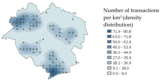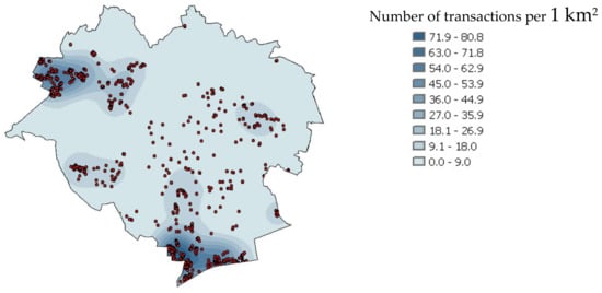 Geostatistical methods play a special role in modelling spatial phenomena of real estate markets since they enable a description and identification of spatial continuity which, in turn, is an inherent feature of many phenomena in real estate markets (e.g., [,,,]). These models can be developed on the basis of spatial relationships analysis (e.g., [,,,,]). The possibility of using geographically weighted regression models has also been described extensively (e.g., [,,,,,,]). Therefore, it was decided during this study that price simulation can be based on a properly built statistical model which mainly takes into account spatial relations. A simulation of transaction location will be based on the assumption that the probability of a transaction is strictly correlated with the spatial distribution of the market activity. Therefore, this simulation can use transaction density models.