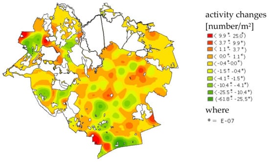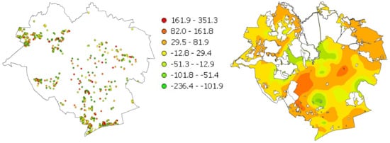 The next step of the spatial market analysis involved examination of the effect of events (transactions) on future market events. The analysis consisted in taking into account the trends in the number of transactions in time. To this end, a model of simple regression was developed at each control point of the study area, in which parameter x denoted successive years of the analysis, and parameter y denoted the transaction density. The slope in the model indicated the direction and rate of the market activity changes. The study resulted in a map of dynamics of the market transaction number (Figure 11), prepared by the kriging method.
