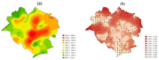 Estimation by kriging: (a) spatial distribution of the model value (PLN/m2), (b) prediction error of the model value, kriging (.