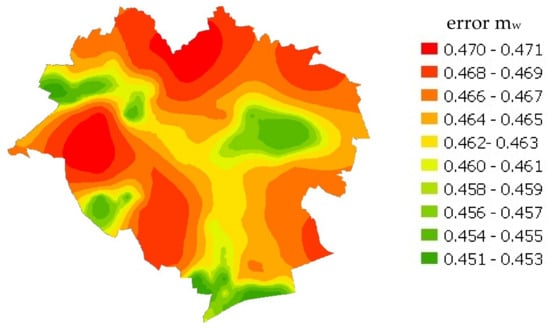 Estimation of the model value using kriging was intended to determine the model value at places of simulated transactions. The spatial distribution of the model value and the prediction error of the model value resulting from estimation by kriging are shown in Figure 6.