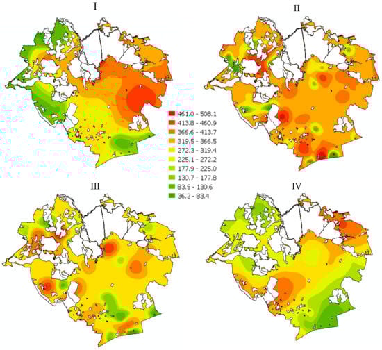 Moran’s I global statistic, which reflects the degree of correlation of a variable under study at a given location with the values of the same variable at other locations, is the measure of spatial autocorrelation. The presence of such a relationship means that values are grouped spatially. If the autocorrelation is positive, clusters (groups) are formed of similar values (large or small) of the variable under observation. A negative autocorrelation is the opposite of a positive autocorrelation, i.e., large values of the observed variables are next to small values of those variables and low values are close to large ones []. Calculations provided the value of Moran’s I statistic, its expected value and variance (Table 5).