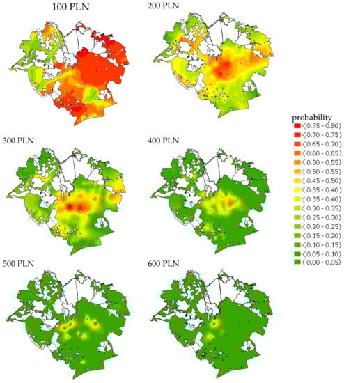 Additionally, maps of probability of specific prices were prepared as an effect of the analyses. Maps of price probability of varying threshold levels (PLN 100, PLN 200, PLN 300, PLN 400, PLN 500, and PLN 600) were generated using the base data on transactions in the years 2004–2015 and the probabilistic kriging capabilities. The results of the analyses are listed in Figure 10.