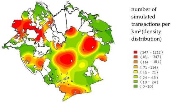 The analysis resulted in creating a map of simulated transaction density, which was based on the map of dynamics and the market spatial activity during the last year of the analysis (kernel function distribution for h = 500 m). The results are shown in Figure 12.