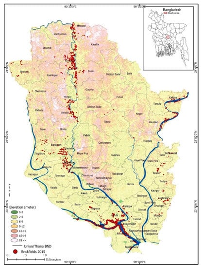 Studying the spatial distribution of geographic events on the landscape is one of the oldest branches of regional science, environmental studies, economic analyses, and development studies [,,]. Spatial analysis techniques help to identify the structures and also suggest reasons for spatial pattern characteristics []. Spatial analysis with geographic information systems (GIS) and the analysis of remotely sensed data are often used to monitor the space-time dynamics of geographical events. These have been proven to be effective tools in landscape planning and dealing with environmental problems such as air and water pollution, land degradation and site management [,]. Brickfield pollution is a critical issue; however, there have been only a few studies on addressing this topic in the greater Dhaka and larger region. For example, in [], authors studied pollution from brick clusters in Dhaka, suggesting that the total emission of PM2.5 is approximately 23,300 tons, followed by 15,500 tons of sulfur dioxide (SO2), 302,000 tons of carbon monoxide (CO), 6000 tons of black carbon (BC), and 1.8 million tons of carbon dioxide (CO2) per year. A similar study examined particulate matter, black carbon, gaseous pollutants and volatile organic carbon on three different brick making technologies from eighteen selected brickfields and estimated that the total emission from brick kilns in Greater Dhaka region is approximately 4526 tons of PM2.5, 304 tons of BC, 209,776 tons of CO2, 8700 tons of CO, 19,441 tons of SO2, and 835,450 tons of volatile organic compound (VOC) per year [].