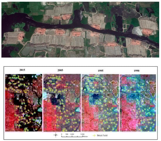 These brickfields and brickyards are visually apparent in satellite imagery, both in high-resolution true color imagery or in false color composite multispectral imagery. In addition, their shape, structure, and the actual operating area is easily distinguishable and can therefore be traced from high-resolution satellite imagery (Figure 3). We digitized each potential brickfield site in four time steps—1990, 1995, 2005, and 2015—using Landsat imagery associated with Google Earth (GE) time-lapse and GE high-resolution imagery. Google time-lapse is a time-series visualization of global land changes. These are non-static images, spanning from 1984 onwards. Since we do not have any high-resolution imagery for the year of 1990 to verify brickfield locations on Landsat 30-m resolution images, we used as a proxy information to track brickfield cluster on Landsat images. Even though GE time-lapse imagery is more useful for change detection covering larger areas than micro-scale analysis, we found these time-series could still be useful when detailed high-resolution imagery is not available. Hence, we played back and forth with these time-lapse images to map and trace the approximate location of each brickfield on the Landsat images. Initially, we identified each brickfield site on the 2015 GE imagery and digitized their extent with polygon geometry. The centroids of these brickfields were also recorded as points.
