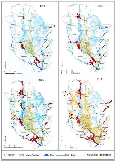 As most of the brickfields in the study area only operate during the dry season (between November and May), we downloaded cloud-free satellite imagery for 1990, 1995, 2005, and 2015 during December and January. Urban growth and the land cover map of greater Dhaka were derived from a previous study []. Other datasets, such as the administrative boundaries in the study area, road networks and water bodies were retrieved from the Detailed Area Plan-2016 for the Greater Dhaka.