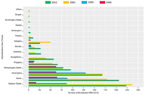 Pattern of brickfield distribution in Greater Dhaka from 1990 to 2015. Numbers of brickfields were aggregated at the Thana level (sub-district level).