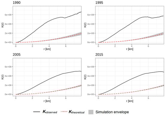 where r is the distance and is the density (number of brickfields per areal unit). Edge correction is necessary when the radius extends over the boundary of the study area, and it is done by multiplying the expression with a weight. This weight will be equal to 1 if a circle with r radius inserted on a random point is completely within the study area and will proportionally fall between 0 and 1 if a portion of that circle’s circumference falls outside the study area []. The theoretical K function under CSR (for the homogeneous Poisson process) can be calculated as When the observed K value is larger than the Ktheo for a particular distance, the point distribution is more clustered than a random distribution at that distance. When the observed K value is smaller than Ktheo, the pattern can be considered dispersed at that distance. Statistical significance can be tested with Monte Carlo simulation. The observed K(r) for 1000 CSR patterns will establish a lower and upper confidence interval at the 99.9% significance level.