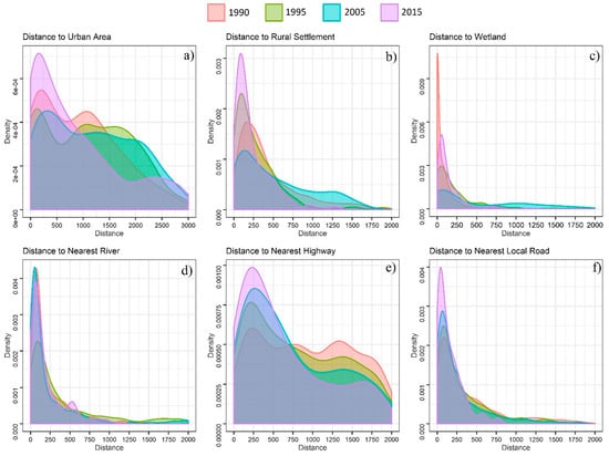 Figure 7 plots nearest neighbor distances as density functions. Density plots were chosen to avoid arbitrary binning of the data over different ranges of distances, which would have been required in order to show distributions as histograms. The area below each density curve is equal to 1, which is a convenient way to highlight the differences between the yearly distribution of nearest neighbor distances. For each year, the shape of the density curves for rural areas (Figure 7b), wetland (Figure 7c), rivers (Figure 7d), and local roads (Figure 7f) are similar, indicating that most brickfields remained at approximately the same distance from these objects. One possible explanation for this is that the brick manufacturing industry did not favor rural areas, and local roads play a minor role in brickfield expansion. However, the similar patterns for wetlands and rivers are due to the fact that brickfields in the Greater Dhaka area are traditionally located mainly on riverbanks and wetlands surrounding its periphery. Similar patterns were also observed for the newly developed brickfields as seen in Figure 8b–f. All newly developed brick manufacturing sites tend to be setup in wetland areas, and close to riverbanks. The possible explanation for this trend is related to the location of cheap land and access to transportation along with the availability of raw materials such as earth surrounding the river channel across Dhaka.