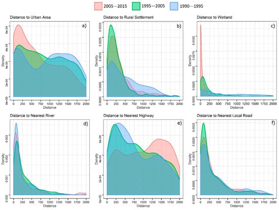 Nearest neighbor distances between brickfields and urban areas (a), rural settlements (b), wetlands (c), rivers (d), highways (e), and local roads (f) plotted as density functions. Distance on the horizontal axes are indicated in meters, and vertical axes represent bandwidth along with the peak of a density where values are concentrated over the interval.