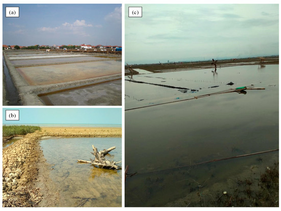 Globally, coastal flooding have been devastating events causing cost for human environment, increase property damage, and around 20 million people are exposed to present high tide levels and 200 million to storm tide levels [1,2]. Currently, the Intergovernmental Panel for Climate Change (IPCC) report suggests that the global mean sea levels will increase 36–71 cm by 2100 based on Representative Concentration Pathway (RCP) 4.5 mid emissions scenario [3]. This situation may increase the vulnerability of coastal regions, especially of cities, due to demographic trends and economic expansion [4,5]. Meanwhile, in developing countries where various types of agricultural activities dominated the local economies, the impact is either ignored or simplified using rough estimates because of low expected losses [6,7,8]. Moreover, local types of agriculture such as solar salt production in tropical countries are also facing the impact of tidal flooding in particular location, which is overlooked in the global discussion. This type of agriculture, however, has the potential to generate revenue from salt in various aspects, not only in terms of salt product quality, but also for tourism, or even partly for coastal research centers [9].