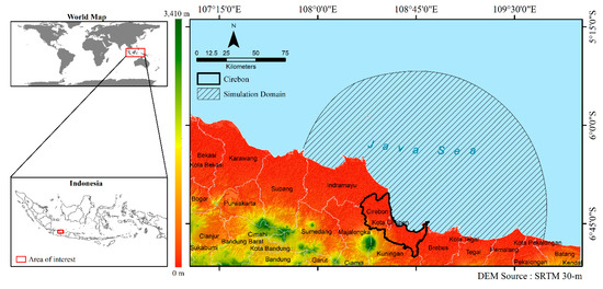 Geographical situation in Cirebon within typical coastal lowland adjacent to Java Sea and simulation coverage area.