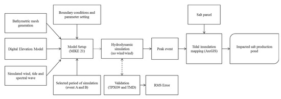 After the work with MIKE had been completed, the result was exported using “MIKE2Grid” for further spatial processes. This produced an ASCII file that is readable in ArcGIS. Importing this file and reorganizing the classes produced the inundation map of MIKE 21. Finally, we superimposed the grid data to the salt parcel dataset and used the tidal simulation as a basis in inundation analysis process. This plot dataset has a shapefile format, which is suitable for further handling in ArcGIS. The inundation map was created by using grid data of both simulations in ArcGIS. The two-top water levels of the selected simulations, which were identified with the maximum value in the data series that was used as a benchmark for inundation analysis. In this research, certain assumptions were made, such as that no precipitation data inputs were used during the period of the incident as it may raise the inundation level, no sea-level rise and land subsidence were considered in the simulation, as there is still no strong local evidence of both factors in the research location. The overall steps of this research are summarized in Figure 4.