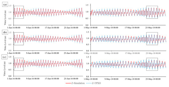 Comparison of water level between simulation and TPXO on June 2016 (left) and May 2018 (right) at (a) P1—Tawangsari; (b) P2—Pangenan; and (c) P3—Bungko.