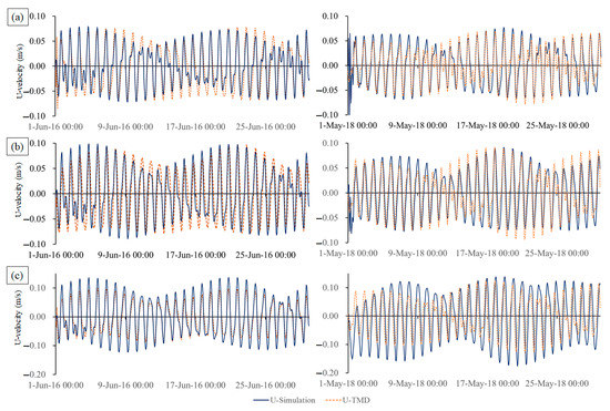 Comparison of u-velocity component between MIKE and TMD on June 2016 (left) and May 2018 (right) at (a) P1—Tawangsari; (b) P2—Pangenan; and (c) P3—Bungko.