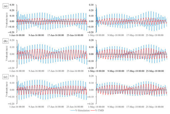 Comparison of υ-velocity at verification points and TMD on June 2016 (left) and May 2018 (right) at (a) P1—Tawangsari; (b) P2—Pangenan; and (c) P3—Bungko.