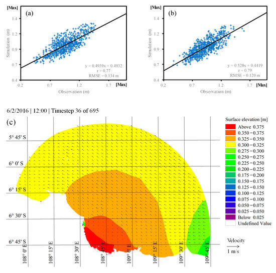 Scatterplot and RMS error of simulated surface water elevation with tide gauge observation on: (a) event A; (b) event B within peak level of water during simulation on; (c) 2 June 2016 12:00 UTC (steps 36); and (d) 25 May 2018 11:00 UTC (steps 587).