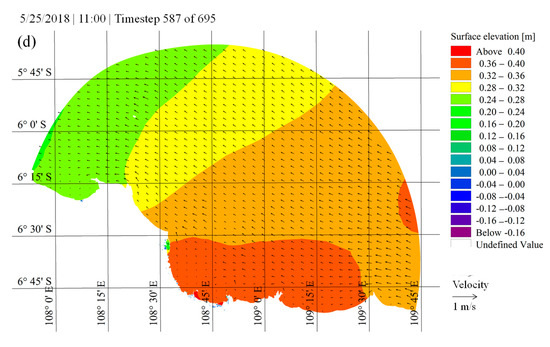 Based on the calculation, the wind involved in the simulation showed correlation values to tidal gauge observation 0.761 with RMSE of 0.134 m for event A and 0.79 with RMSE 0.120 m for event B. As a result, surface elevation at the peaks of both tidal events in Cirebon reached 0.38 m (event A) on the 2nd of June 2016 12:00 UTC and 0.40 m (event B) on the 25th of May 2018 11:00 UTC. Gurumoorthi and Venkatachalapathy [68] and Pugh [69] mentioned that the relative importance of diurnal and semi-diurnal components differ with geographical position and can be calculated by the formulation factor: