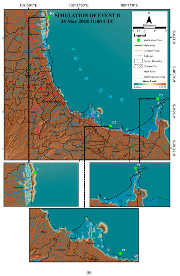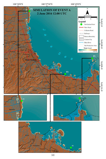 To get a sound validation of our model for tidal simulation, this study used tidal data of the open boundary model that were obtained from the global tidal model. Following the step from Ningsih et al. [60], the model compared the results of simulated sea level from MIKE 21 with tidal station in Cirebon from BIG and also the global tidal model TPXO9 (this model can be accessed on http://volkov.oce.orst.edu/tides/global.html). TPXO9 is the latest version of TPXO-series [61,62], which includes global tidal solutions with 1/6° resolution that fit, in least-square, both the Laplace’s equation and also the long track averaged data from TOPEX/Poseidon and Jason (on T/P tracks since 2002) [61,63]. Tidal constituents of the tide record from BIG tidal station perform comparable values with tidal constituents from the global tide modeling TPXO in Indonesian waters [64]. At this point, the wind factor was excluded and focused on gravitational force only. Moreover, the tidal current velocity was verified with Tidal Model Driver (TMD). This free MATLAB package offers harmonic constituents for tide models, making predictions of tide height and also currents [65]. Verification points of the selected simulations (event A and B) are located in Tawangsari, Pangenan, and Bungko (as pointed P1-P3 in Figure 5). The model exposed the statistical correlation using the Pearson value (r) of the three locations with general tidal model of TPXO9, and presented the value of the Root Mean Square (RMS) error. The RMS error was calculated with: