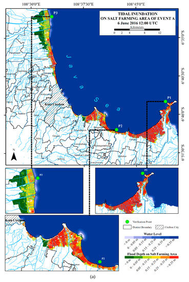 This paper presents simulation of the inundated areas upon salt farming due to tidal flood events. Tidal floods that occurred upon salt production area were triggered by the high tide events in Java Sea. That two events were similarly situated to tidal incidents located along the southern part of Java adjacent with Indian Ocean [71,72]. Both periods studied present similar tidal elevations. Inundation dominantly occurred in the western and eastern parts of the region. The total impacted salt production area in both events were about 6489.4 ha (event A) (83%) and 6570 ha (84%) (event B). As illustrated by Châu [73], the inundated area may be overrated based on data characteristics and the methods employed. Different resolutions of DEM may result in different total area of inundation. Furthermore, bathymetry, wind velocity, and Manning coefficient also correlate with the hydrodynamic process of tidal forcing.