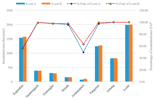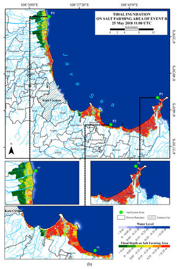As mentioned in the previous section, the results regarding the submerged area of around 0–0.38 m for (event A) and 0–0.40 m for (event B), have significantly affected the salt production areas in Cirebon. Based on previous maps (Figure 11), it can be seen that around 1990.55 ha of salt production pond in Losari were inundated during event A and 1992.07 ha during event B. This district is also recorded as the most impacted area due to both tidal flood events (99.92% and 99.99% of total cultivated area in Losari). The salt production area of Gebang, which is located in the west part of the study area, has also been flooded up to 816.32 ha (100%) during the events A and B. At the same time, a slight increase of flood coverage has occurred in Kapetakan due to both tidal events. During the peak level of event A, almost 56.15% or 1,538.96 ha were exposed to tidal floodings, and 57.22% or 1,568.34 ha suffered inundation according to our simulations. In the middle part, tidal heights of both selected simulations in events A and B have submerged Suranenggala, Gunungjati, Mundu, and Astanajapura to a lesser degree in terms of total area, but with more significant percentages of inundated salt pond (approximately 49–99% in both events). The model presents the areas of inundation on A and B events as it is drawn in Figure 12.