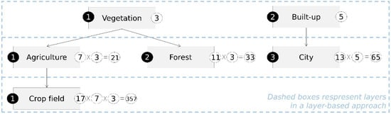 The following example is carved out from a real-world application of land cover classes as a simple way to illustrate the equations. Suppose we want to encode the simple hierarchy, which is shown in Figure 2. In a layer-based approach, each horizontal block (depicted in dashed lines) corresponds to a layer with the black numbers as the code. In this case, they start with one for each layer as individual categories and can be referenced by layer index and identifier, e.g., “Agriculture” would be code one of layer two.