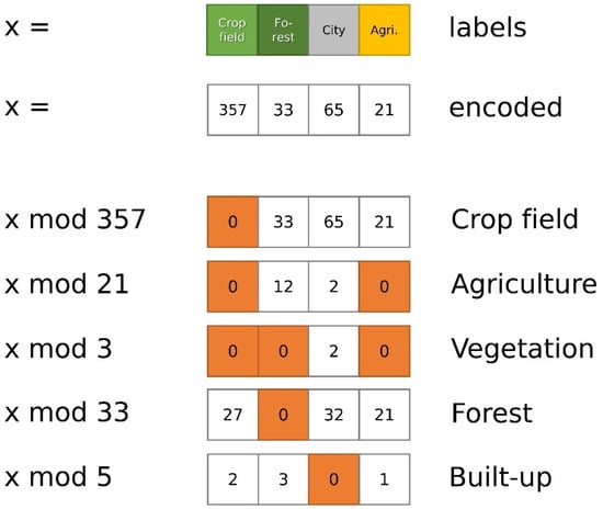 The array consists of cells with the concepts “Crop field”, “Forest”, “City”, and “Agriculture”. When encoded using prime numbers, the cells contain the values 357, 33, 65, and 21. The lower part of the figure shows masks for different labels, where the zero indicates a match and a non-zero value a non-match. To illustrate Equation (2), consider the vegetation mask, which is a result of
