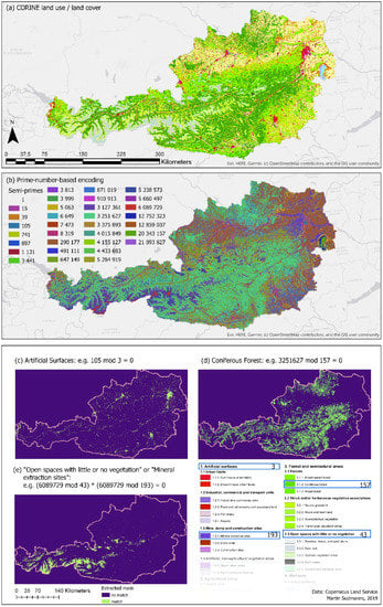 Many geographical phenomena and their representations are hierarchically structured. A prominent example is the CORINE land use/land cover dataset provided by the EEA as part of the European Copernicus land monitoring service. The CORINE legend consists of three hierarchical levels, where, for each level, the numbering of the category identifiers starts with one and continues with the next positive integer. For each location, exactly three integers describe the land use/land cover. They are concatenated to a single value, for which the integer position can be used to reconstruct the category identifiers per level. I downloaded the raster representation directly from the EEA website and created a spatial subset (Austria) to illustrate the use-case. I encoded the legend using prime numbers and multiplied the numbers of the three hierarchy levels for each position to obtain a single value, which can be stored in the raster cells. By testing the modulo result of the cell values with a candidate prime number from the legend, it is possible to reconstruct and mask every class on any hierarchy, also in combination. Figure 4 shows three exemplarily created masks on the first level “Artificial surfaces” (c), the third level “Coniferous Forest” (d), and a combination of the third and the first level “Open spaces with little or no vegetation” or “Mineral extraction sites” (e). Although the masks matched legend entries on different levels and even a combination of legend entries across levels, they were simply created using the Equations (2) and (4). Knowing the schema of the dataset, i.e., translating the legend level into integer positions or band indexes was not necessary. Further, since this approach does not require a schema anymore, it also avoids the requirement of having exactly three immutable hierarchy levels. A legend key, which translates the legend items into cell values, is required and provided to the users in the existing CORINE encoding and the prime number encoding. The only difference is that the source dataset can be encoded with 16bit signed integers (as is the source dataset encoding), which need to be changed to 32 bit integers, which occupies more disk space.