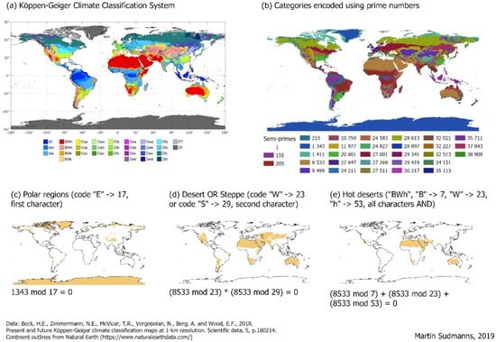 Köppen-Geiger climate classes with data based on [17] are encoded using prime numbers. This allows category identifiers to be selected for any topic and in any combination. (a) Is the original Köppen-Geiger classification, (b) is the encoded version using prime numbers. This illustration is for explanatory purposes only; it is not shown to the users. Three different masks on the bottom exemplarily demonstrate the access versions. (c) Shows a selection of polar regions from the first topic (first letter). (d) Shows a selection of desert or steppe from the second topic combined with OR-logic. Any cell qualifying for any of the two characteristics will be returned as a match. (e) Shows a combination of three codes from all topics with AND-logic. In this case, the regions with BWh climate (hot deserts) themselves are extracted.