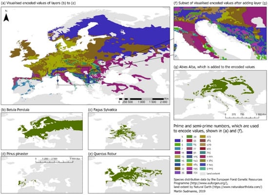 Tree species distribution across Europe requires handling of overlapping regions. In this case, the species Betula Pendula (b), Fagus Sylvatica (c), Pinus pinaster (d), and Quercus Robur (e) were encoded with prime numbers as shown in the map (a). Although only one value per cell is required, the spatial distribution of all species is preserved and can be reconstructed without loss. A simple multiplication allows new species to be added, here Abies Alba (g), without the need to change the schema of the dataset (f). The data is obtained from the European Forest Genetic Resources Program (EUFORGEN) [18].