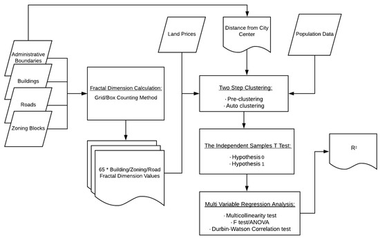 According to the results of both tests, it was decided that using the average land prices on a neighborhood basis would be more appropriate for multivariate linear regression analysis. The independent variables of the regression analysis were the calculated FD values of buildings, blocks, and street networks, and the average land prices were defined as the dependent variables. For this purpose, average land prices with nonnormal distribution were linearized by taking their logarithm. All variables were evaluated in a single step, and it was checked whether there was multicollinearity or not. In the regression models, it is desirable that there is no multicollinearity, therefore the value of the variation inflation factor should not be higher than 10 [47]. Furthermore, the effect of any of the independent variables on the dependent variable was investigated with the F test (analysis of variance, ANOVA), and whether there was a correlation between the dependent and independent variables was investigated by the Durbin–Watson (DW) test. Because the DW value indicated that the variables had a correlation, EFA was used to group together intercorrelated independent variables. In order to use EFA, the Kaiser–Meyer–Olkin (KMO) and Bartlett’s test significance level values should be calculated to determine the sample adequacy. By utilizing the established regression model, the relationships between FD values, which are a component of urban geometry, and average land prices were determined. Figure 3 presents the workflow diagram of the working methodology.